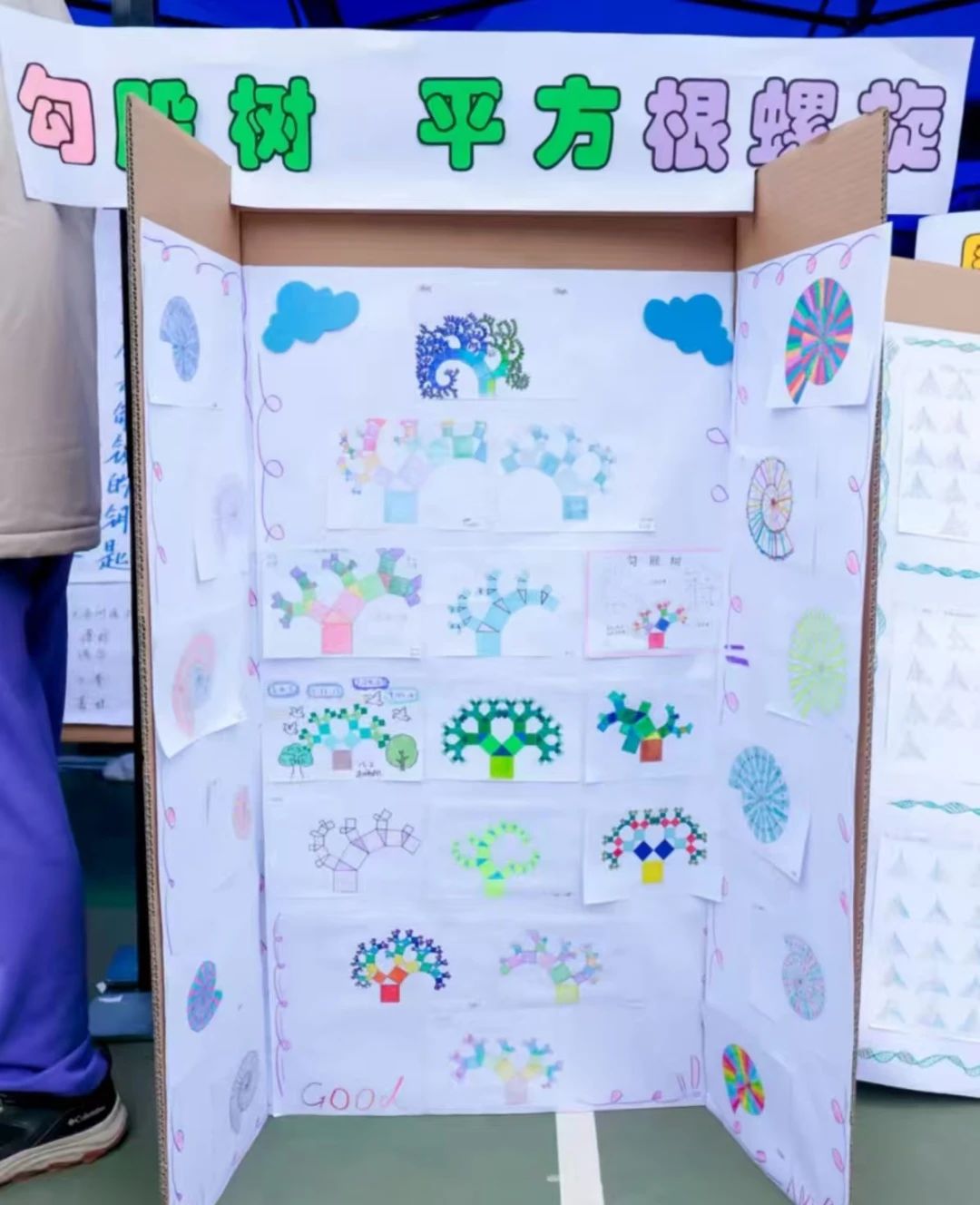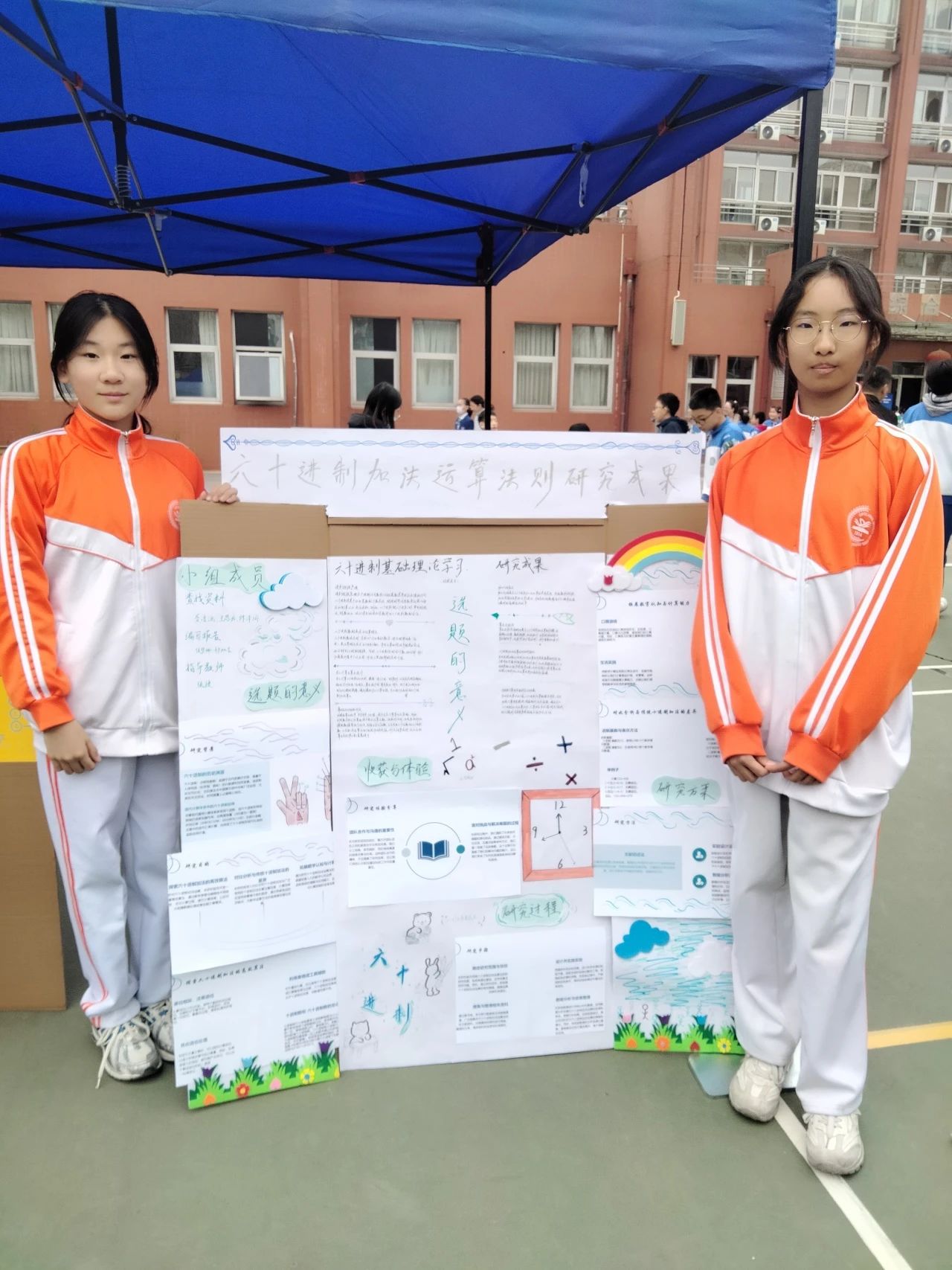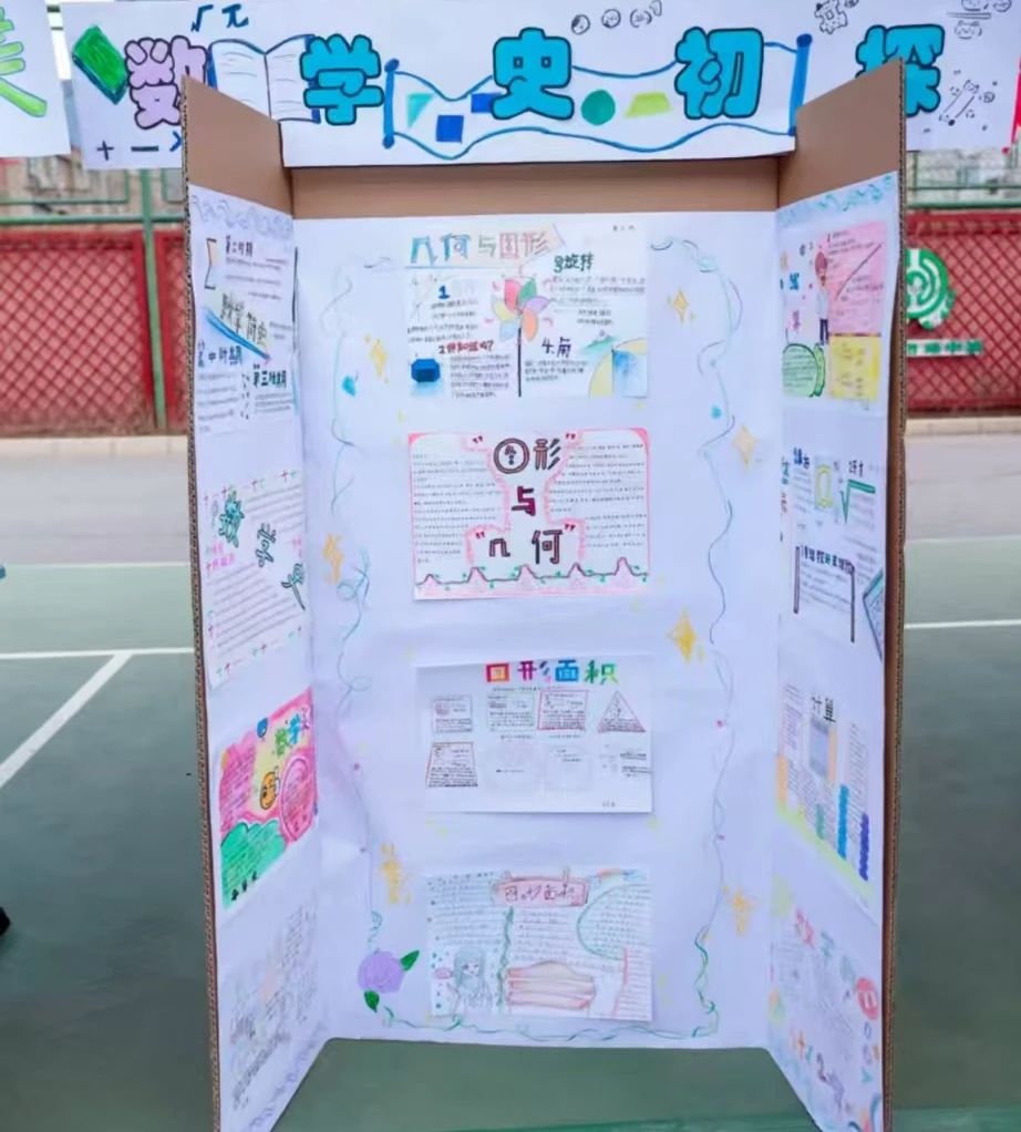 在设计创意、探究创造、文化创想、数字创新、数学建模五大主题板块中,他们完成了7块展板的布展工作,内容分别为六十进制加法运算法则的研究成果、压岁钱的支出方案、勾股数、平方根螺旋、七巧板、数学史初探和图形变换之美,收获了参会领导、教师和同学们的一致称赞。两位同学讲解精炼,还有幸接受了记者采访。
